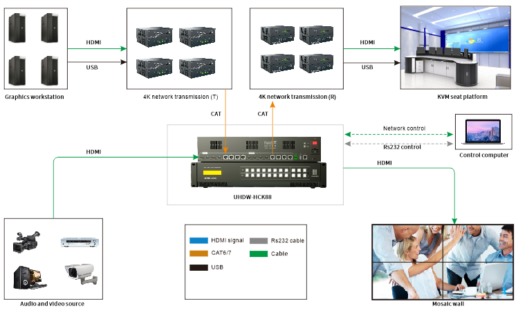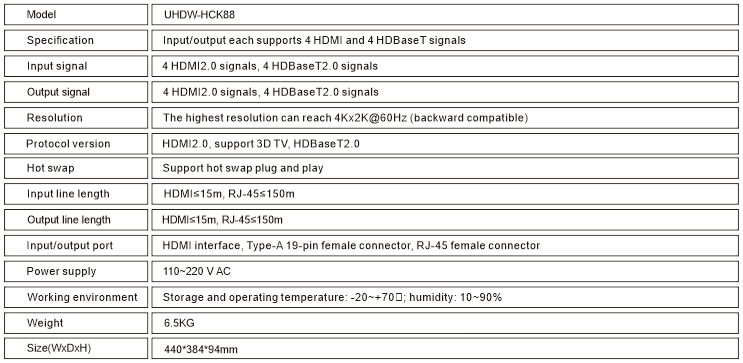 Transmission 4Kx2K@60Hz 4:4:4 matrix switcher, HDMI signal transmission ≥ 5 meters, HDBASET signal transmission ≥ 100 meters;