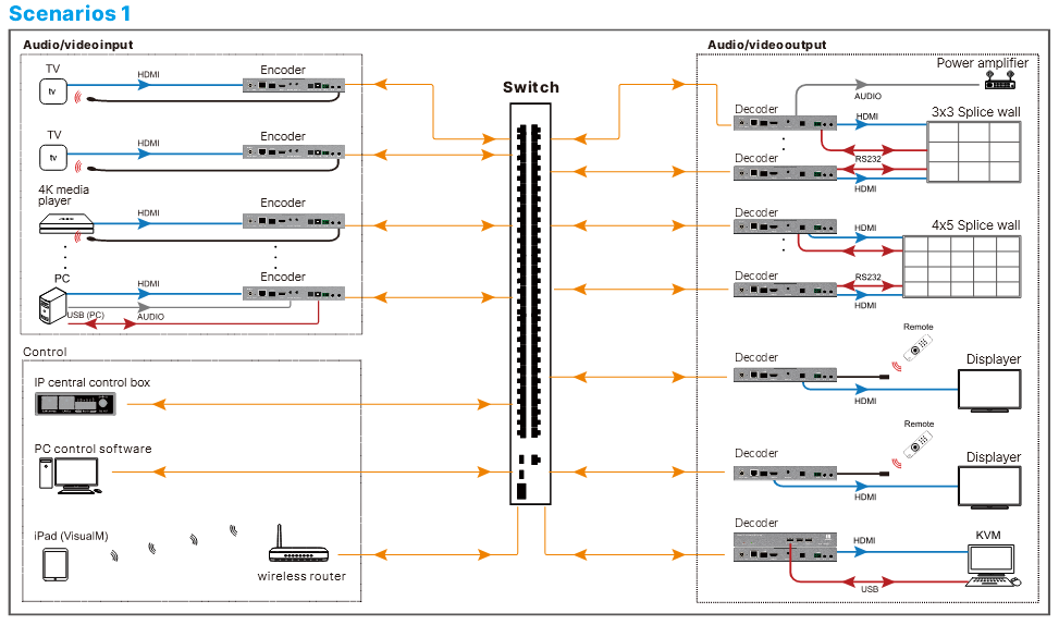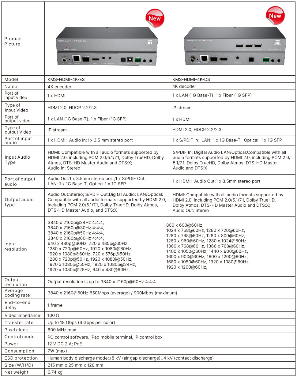 The KMS-HDMI-4K-ES/DS optical network backup system encoder (KMS-HDMI-4K-ES) and decoder (KMS-HDMI-4K-ES) support resolutions up to 3840 x 2160@60Hz 4:4:4, providing a flexible, powerful, and scalable solution. 4K Ultra HD media signals can be switched and distributed over standard Gigabit Ethernet to provide a complete end-to-end streaming system. In the system, audio signals, video siganals, infrared signals, and USB signals can be routed separately or paired as a whole, and the product supports the operation of up to 16 x 16 video walls.