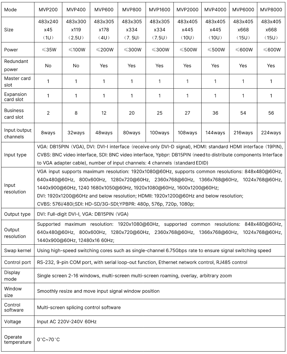 MVP series Multiview Video Wall processor adopts pure hardware architecture, without CPU and operating system, and fully uses embedded professional video image processing equipment with independent intellectual property rights. Guided by industry digitalization, networking, intelligence and other major trends, it provides complete solutions for all walks of life. MVP uses the professional and mature FPGA technology platform as the core processing layer, integrates typical application functions in the industry, and realizes the collection of various video signals, real-time image processing of special digital signals with ultra-large resolution, and IP streaming Media decoding, finally high-definition video signal, acquisition, real-time processing, and finally sending to the display terminal is a complete system architecture. At the same time, the MVP series has the ability of ultra-large-scale splicing display, and can support multiple Channel signal display, and the ability to customize the input/output resolution and other functions, can finally meet the different needs of industry customers from all angles to the greatest extent.