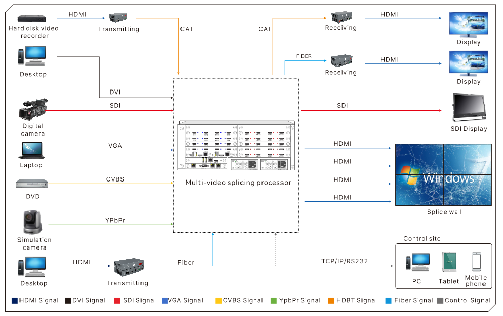 Output supports a variety of video signal source types: HDMI, DVI, VGA, CVBS, AV, SDI, HDBaseT, audio output;