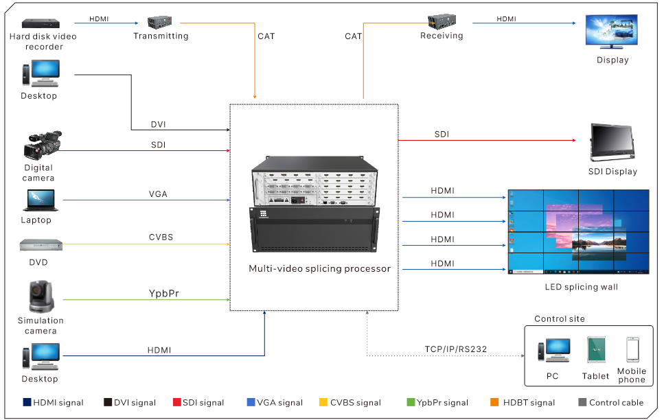 The 4K×2K video wall controller Support central control, IPAD, Android tablet control, can realize grouping function,Separately control multiple groups of splicing screens, each group of splicing screens can be controlled independently without affecting each other;