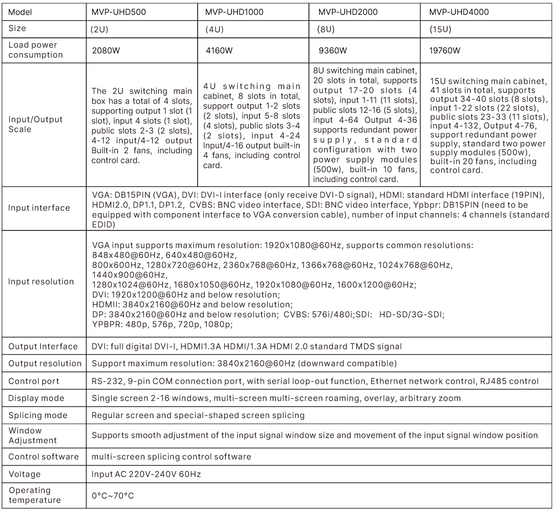 The MVP-UHD series is a 4K ultra-high-definition video wall splicing processor, which combines the technical advantages of traditional control products and integrates multiple functional technologies such as 4K high-resolution acquisition, group management, input and output custom resolution, image display and control processing, and visual management. In one, it provides an unprecedented control platform for a comprehensive visual display and control environment. It is suitable for environments with high requirements on the display environment. It fundamentally guarantees full real-time synchronous processing of all input and output signals, and the display screen has no delay, frame loss, The loss phenomenon occurs with powerful image processing functions. Products can be widely used in digital display, control command center, security monitoring center, conference video center, smart city information center, immersive experience, transportation, government, education, medical care, electric power, energy, media and other fields.