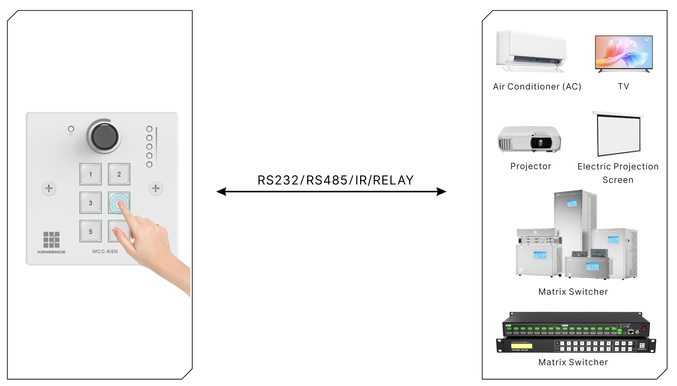The WCC-K6N smart control panel supports custom command programming, allowing each physical button to support multiple commands to be sent simultaneously or with delays, achieving one-touch trigger control for complex scenarios. This device is compatible with the RS232 communication protocol, seamlessly integrating with central control systems, making it suitable for environments such as conference rooms, smart homes, and exhibition halls that require multi-device linkage. Through the command group configuration feature, users can flexibly set the device control sequences corresponding to each button, meeting diverse scene control needs and enhancing automation control efficiency.